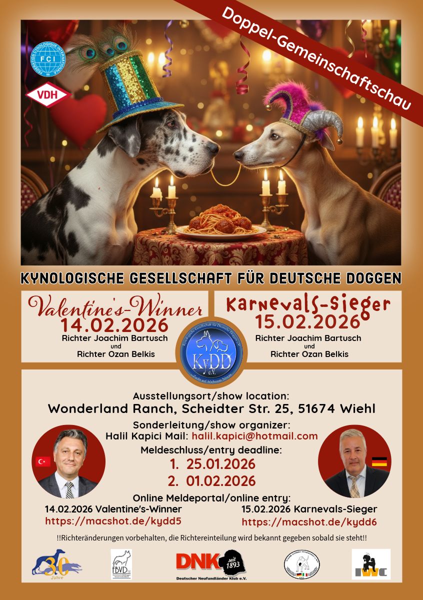 15.02.2025 Doppel-Gemeinschaftsschau KyDD e.V. Karnevals-Sieger Wonderland Ranch Scheidter Str. 25 51674 Wiehl Ozan Belkis (TR) Meldelink Flyer Meldegebühren  1. 25.01.2026  2. 01.02.2026